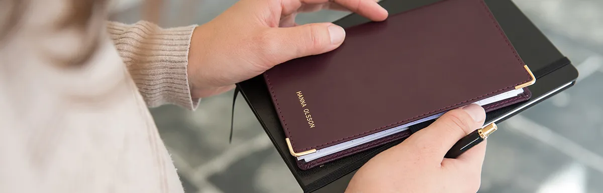 Vår personliga fickalmanacka med skinnomslag och namnet präglat på framsidan är en användbar och uppskattad present. Med tåligt skinnomslag i svart, vinrött eller cognac varar kalendern i många år.
