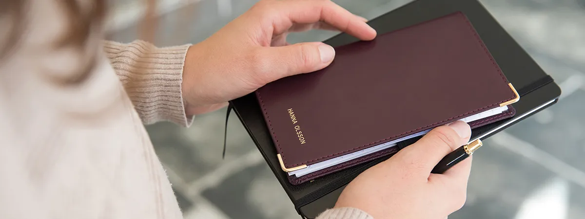 Som privatperson får du alltid ditt namn präglat på omslaget. Företagskunder väljer bland namn- och logotypepräglingar, egna reklamsidor i kalendern.
